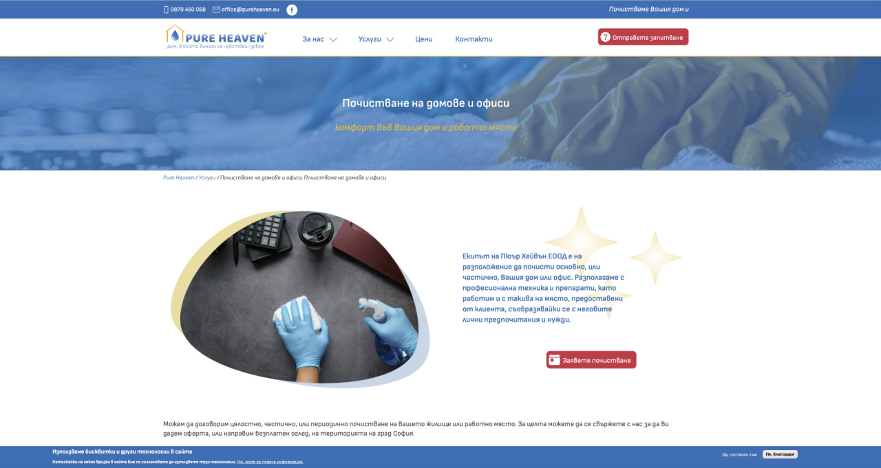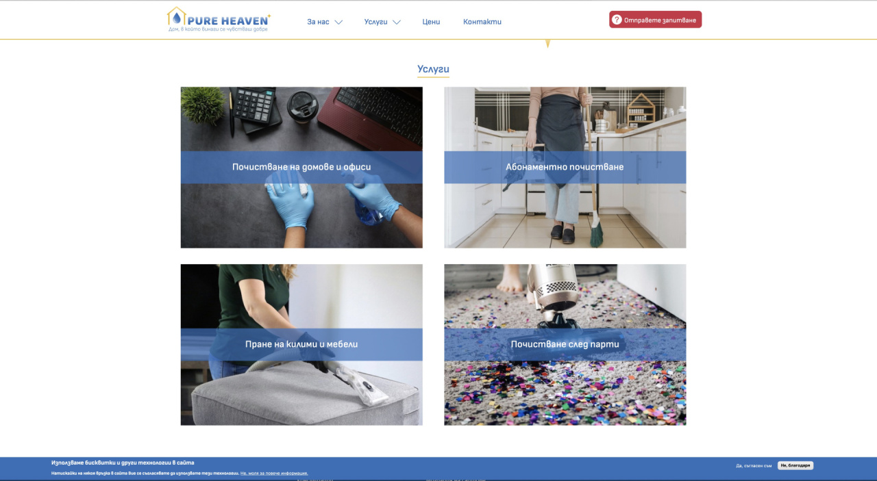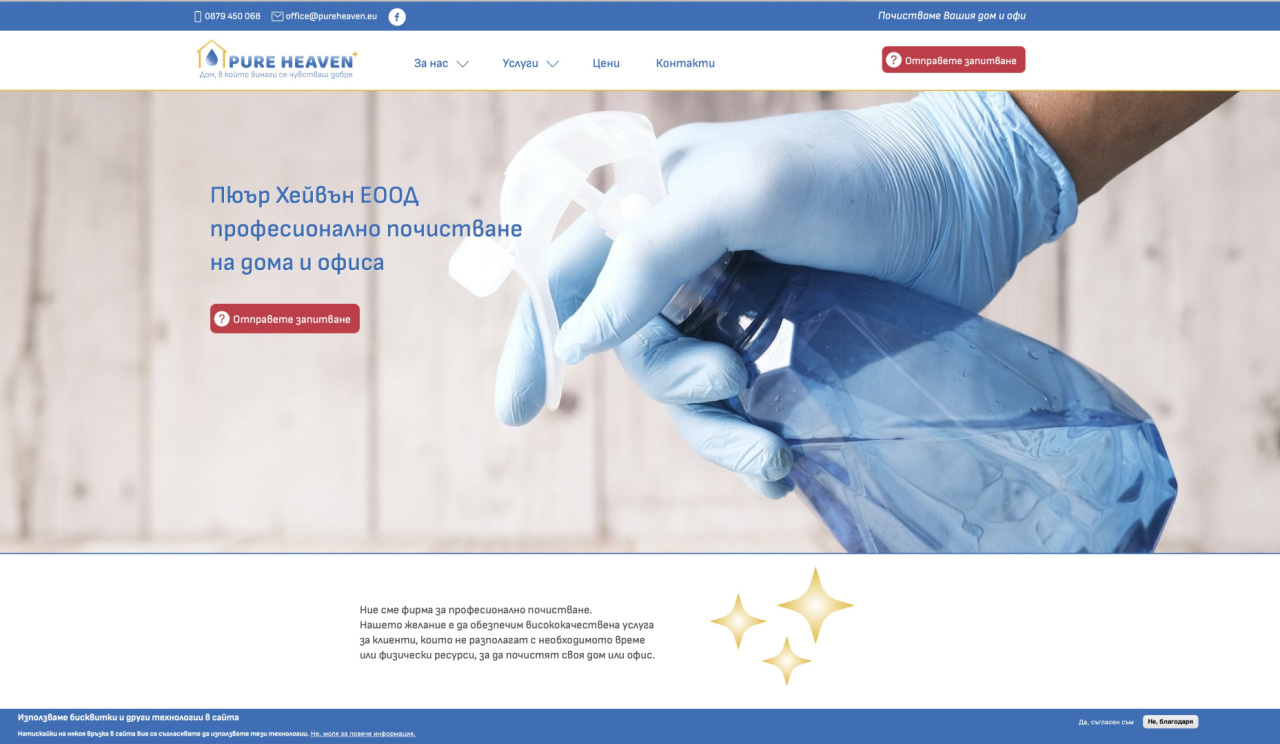 Сайтът се отличава с динамика, лекота на ползване и визуални закачки. Дава възможност на потребители да изпратят заявка за почистване, да отправят запитване и да се запознаят с услугите, предлагани от фирмата. Също така предвидихме място за постоянна обява, с цел набиране на персонал.
