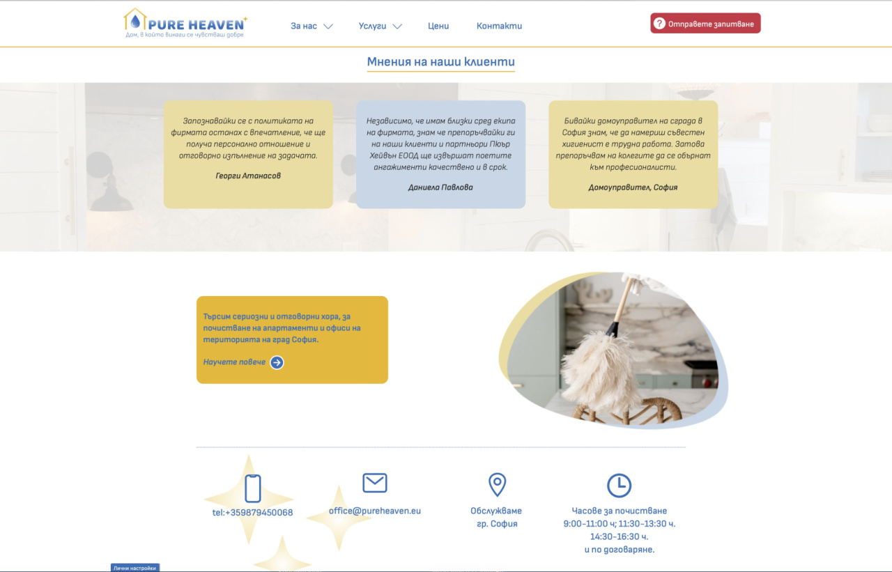 Приложението дава възможност за добавяне на мнения от страна на клиенти. Могат да бъдат добавени още езици, на които да работи и няма ограничение в своята структура. Разработихме персонален, адаптивен дизайн, в който вложихме цветовете и концепцията от оформлението. Резултатът бе стилна и модерна визия на сайт за фирма за професионално почистване.